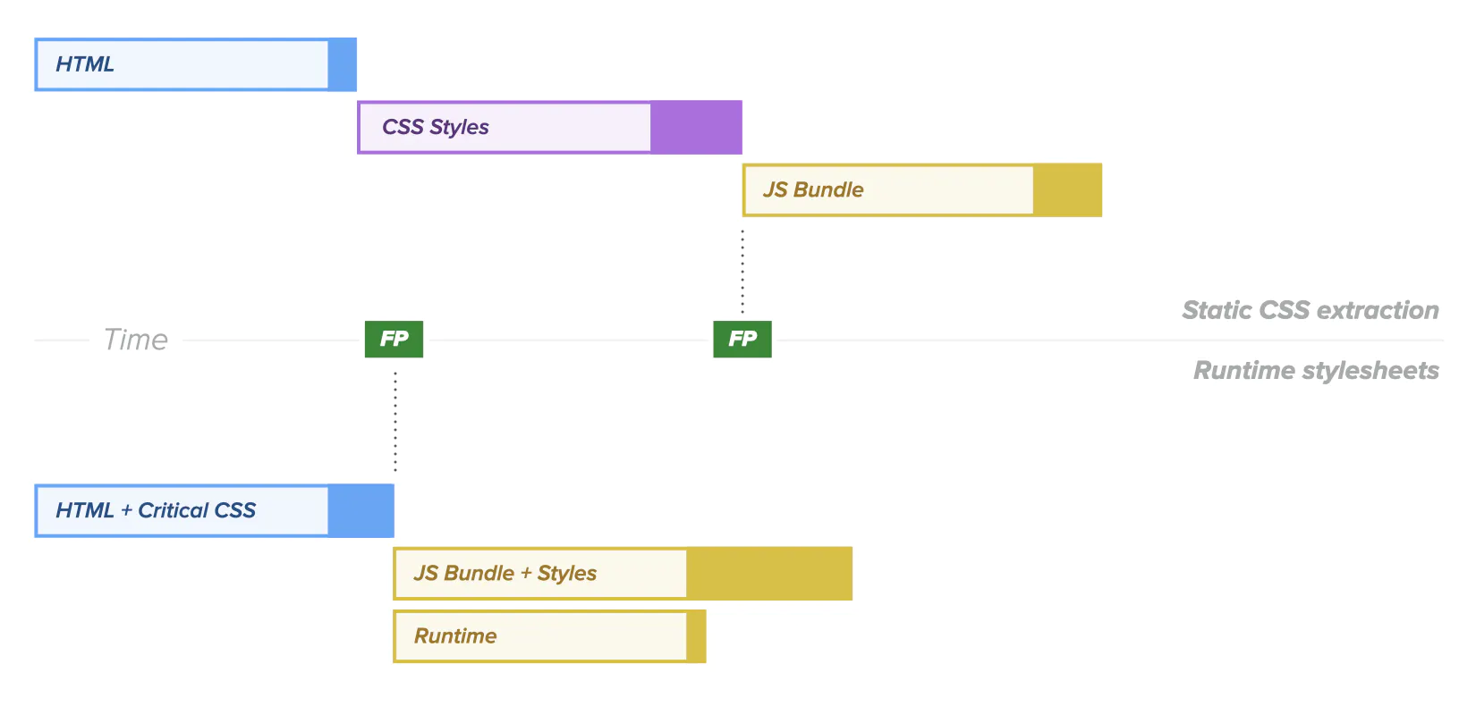 쉽게 이미 빌드시점에서 CSS를 생성해 버려서 첫로드는 빠르지만, 첫 페인트는 느릴수 있다(FP)
